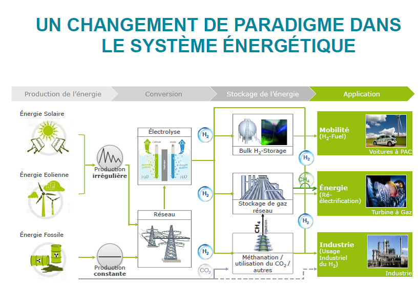 C’est dans ce contexte que se sont développés le concept du « Power to Gaz » (modèle qui consiste à stocker l’énergie, issue de ressources renouvelables, qui serait produite en surcapacité, en transformant cette énergie – le « power » en l’hydrogène ou le méthane de synthèse – le « gaz ») et des projets ambitieux, tels que GRHYD (injection d’hydrogène les canalisations de gaz naturel) ou MYRTE.